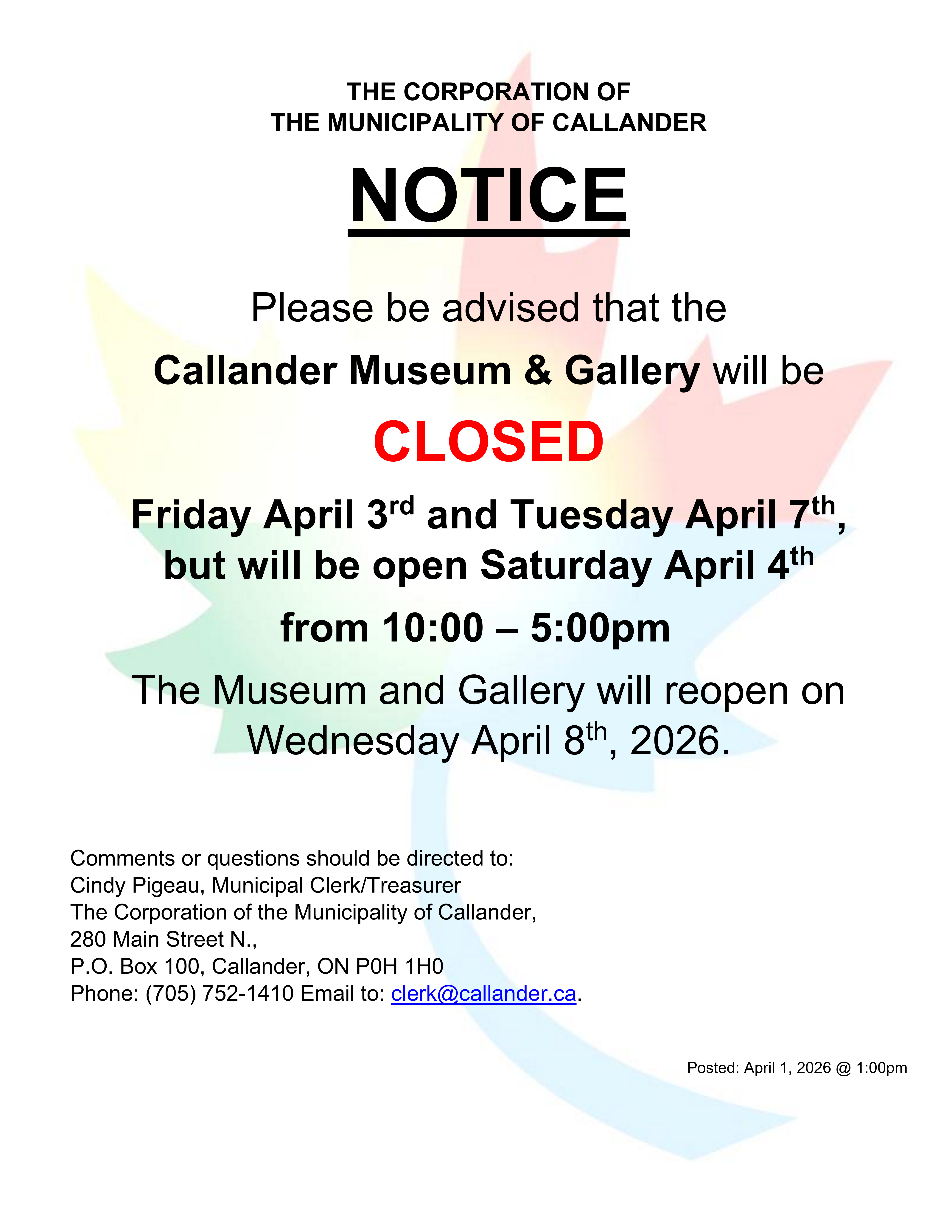 The Callander Museum and Art Gallery will be closed Friday, April 3rd and Tuesday, April 7th for Easter.